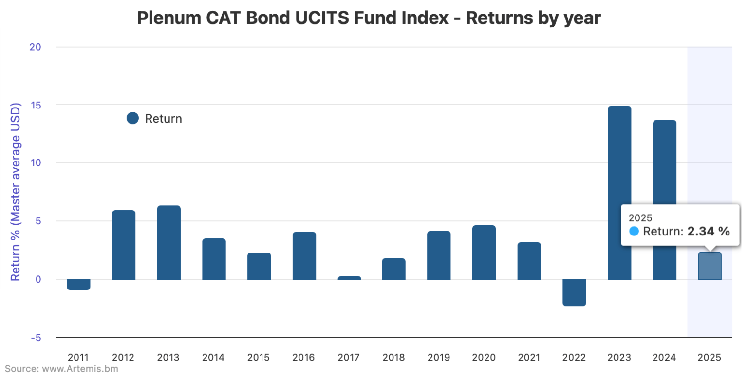 UCITS cat bond fund 12-month return back at 12% | | | UCITS cat bond fund twelve-month return rises back to 12% after positive May With UCITS catastrophe bond funds delivering positive returns to their investors for the month of May, it has helped to lift the trailing twelve-month return for the UCITS cat bond fund sector back to an average of 12%, according to the latest data from the Plenum CAT Bond UCITS Fund Indices. May 2025 saw UCITS cat bond funds average 0.52% making it the second best performing month of the year so far, which lifted the trailing twelve-month return back to 12%, on average. Read the full story. Other articles: | | | | | | Please share this with colleagues and friends if you think they would like to receive it. If you've been forwarded this but want to subscribe, visit Artemis. | | | | | | You may be receiving this because you recently attended an industry event we partnered with, giving us permission to email you. If you don't want to receive our weekly ILS, catastrophe bond and reinsurance capital newsletter please Unsubscribe or Edit your subscription here . © Steve Evans Ltd. - Artemis.bm | | | |