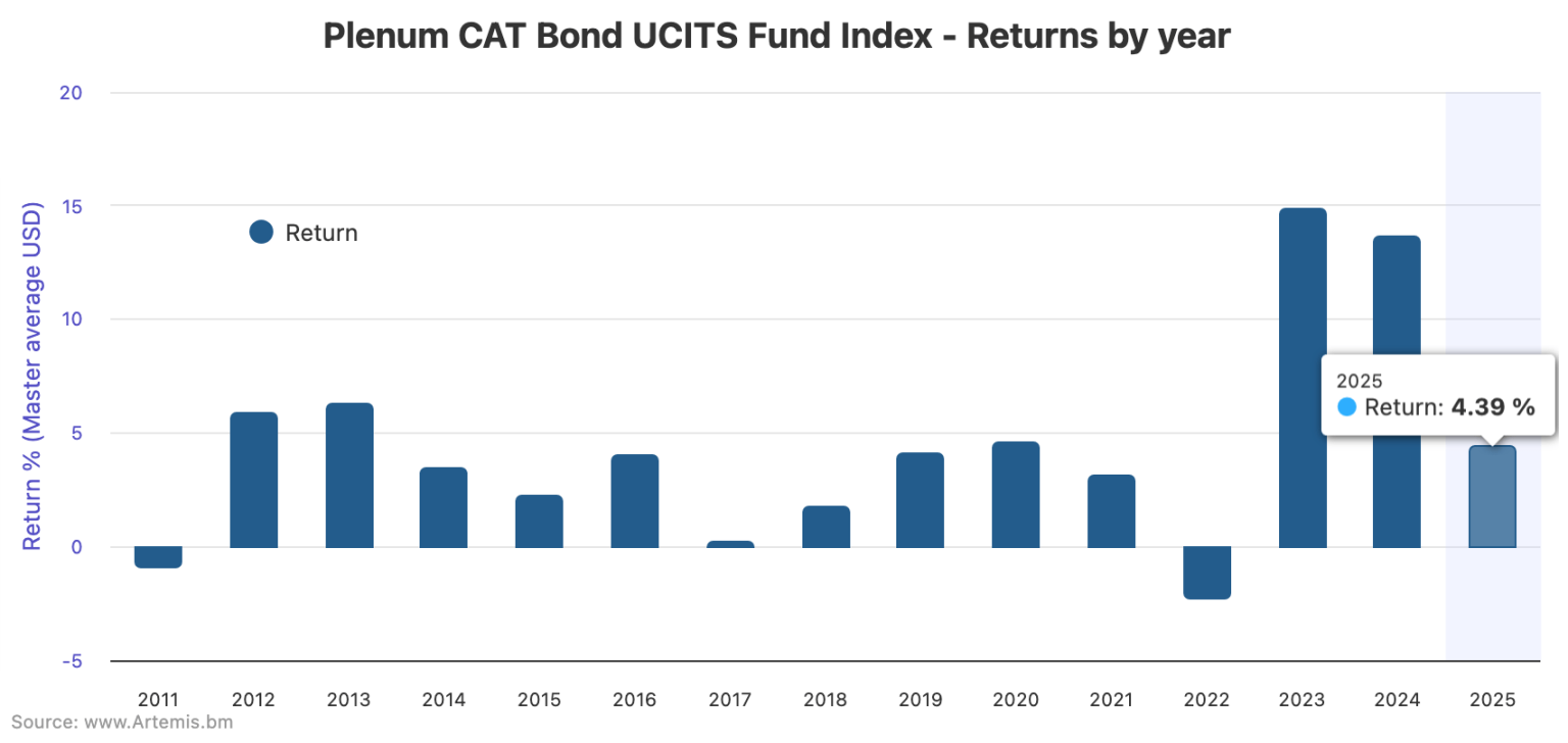UCITS cat bond fund average return hits 4.39% | | | Strong July lifts UCITS catastrophe bond fund average return to 4.39% YTD Catastrophe bond funds in the UCITS format had their best month of 2025 so far in July, as seasonality kicked in and lifted the average performance for the Plenum CAT Bond UCITS Fund Indices to a 4.39% return year-to-date. Averaging 1.09% for July 2025, this group of UCITS cat bond funds are now tracking at an 11.53% return for the trailing twelve month period. Read the full story. Other articles: | | | | | | Please share this with colleagues and friends if you think they would like to receive it. If you've been forwarded this but want to subscribe, visit Artemis. | | | | | | You may be receiving this because you recently attended an industry event we partnered with, giving us permission to email you. If you don't want to receive our weekly ILS, catastrophe bond and reinsurance capital newsletter please Unsubscribe or Edit your subscription here . © Steve Evans Ltd. - Artemis.bm | | | |